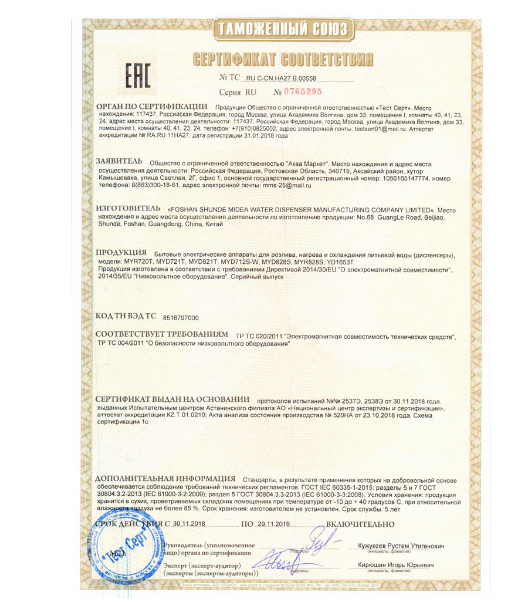 * Из-за расположенного рядом с распределительной емкостью работающего на нагрев бака допускается подача из синего краника первых 150-200 мл воды с температурой на несколько градусов выше комнатной.